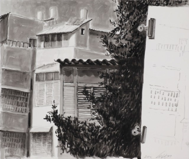 A few days later we visited Rachel at home and saw the view from her studio through her eyes. The gutters, corrugated roofs, trees, windows and chimneys took on another dimension. Her walls were covered with actual portraits, photographs and other mementos of her remarkable ancestors all of whom participated in the rebirth of the Jewish Homeland. The day after the visit my husband and I flew off worrying about the fragile peace that surrounds Rachel’s world.